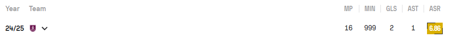 24-25 시즌 기록 : 16경기 2골 1어시스트 (999분)